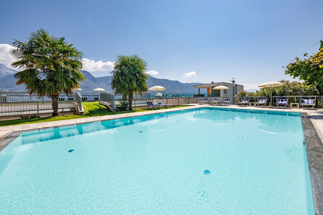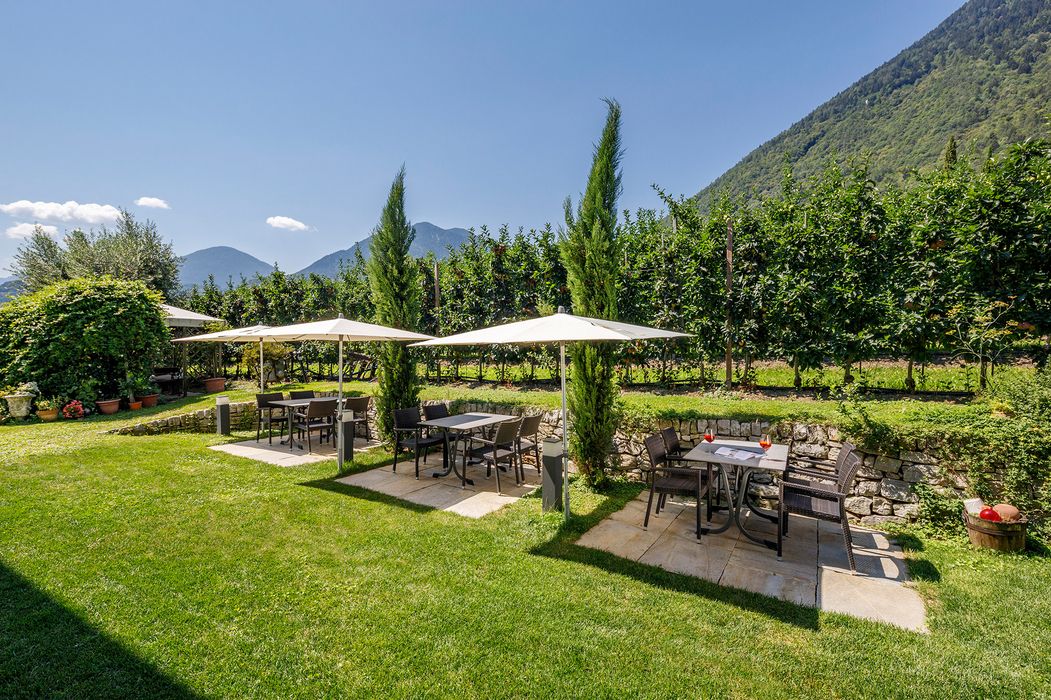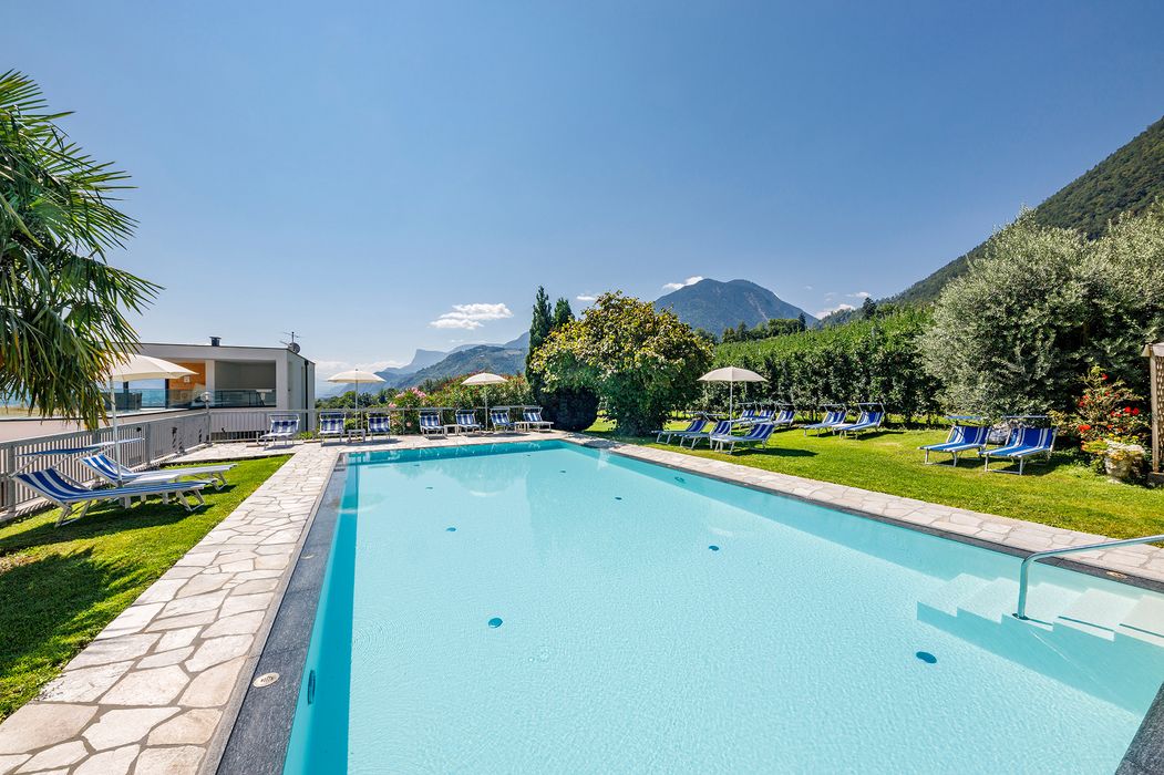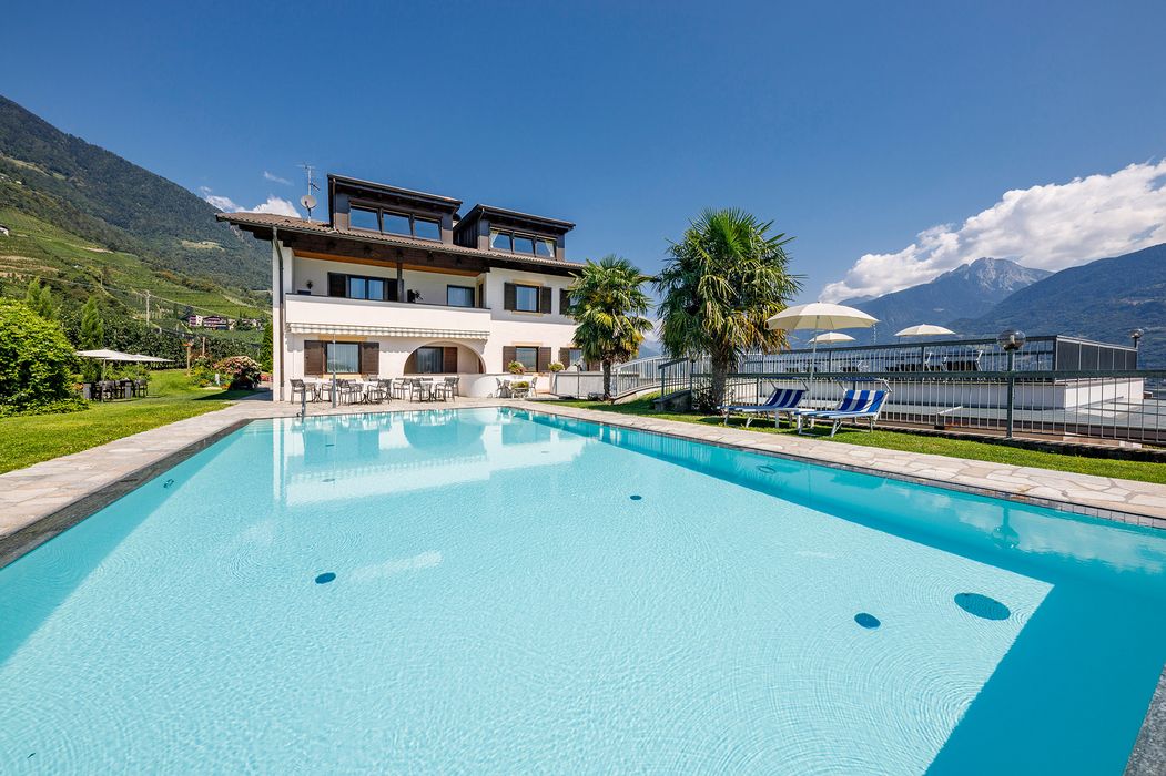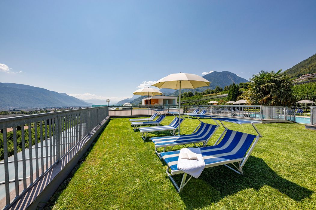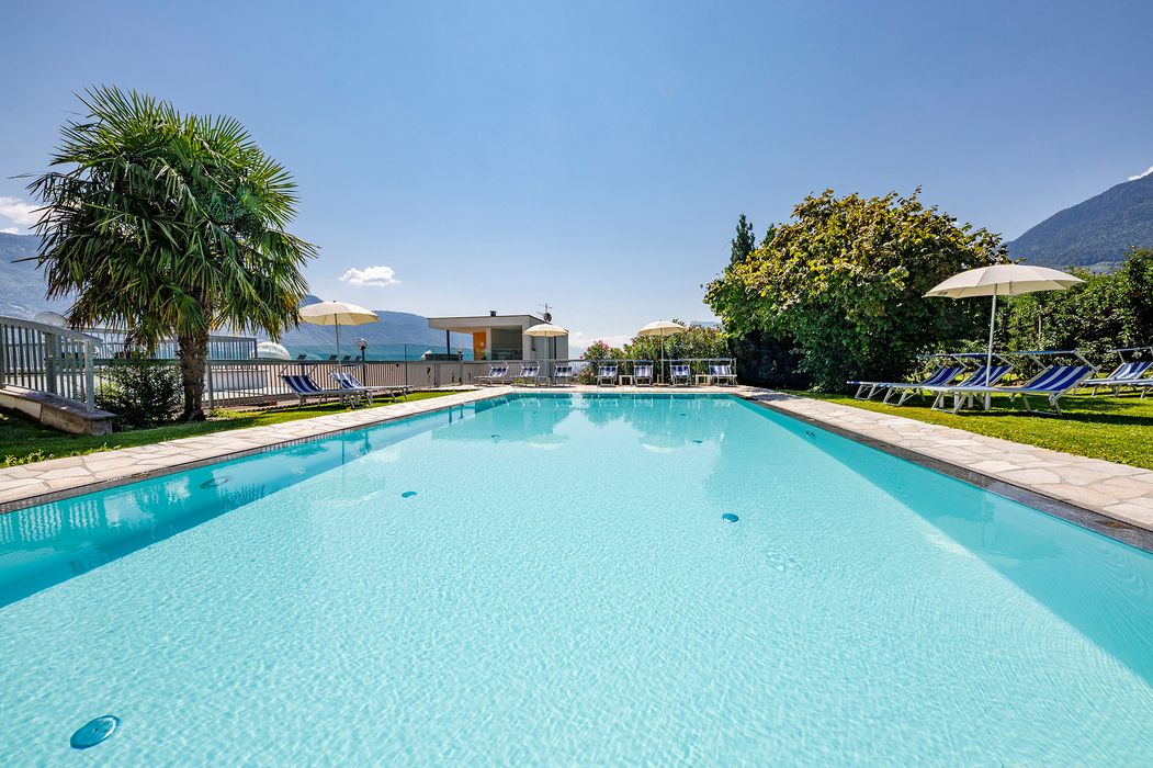 La piscina d'acqua salata offre ai nuotatori grandi e piccoli una vista mozzafiato sui nostri frutteti di mele e sulle montagne circostanti dell'Alto Adige. Già di prima mattina si può fare il bagno „with a view“.