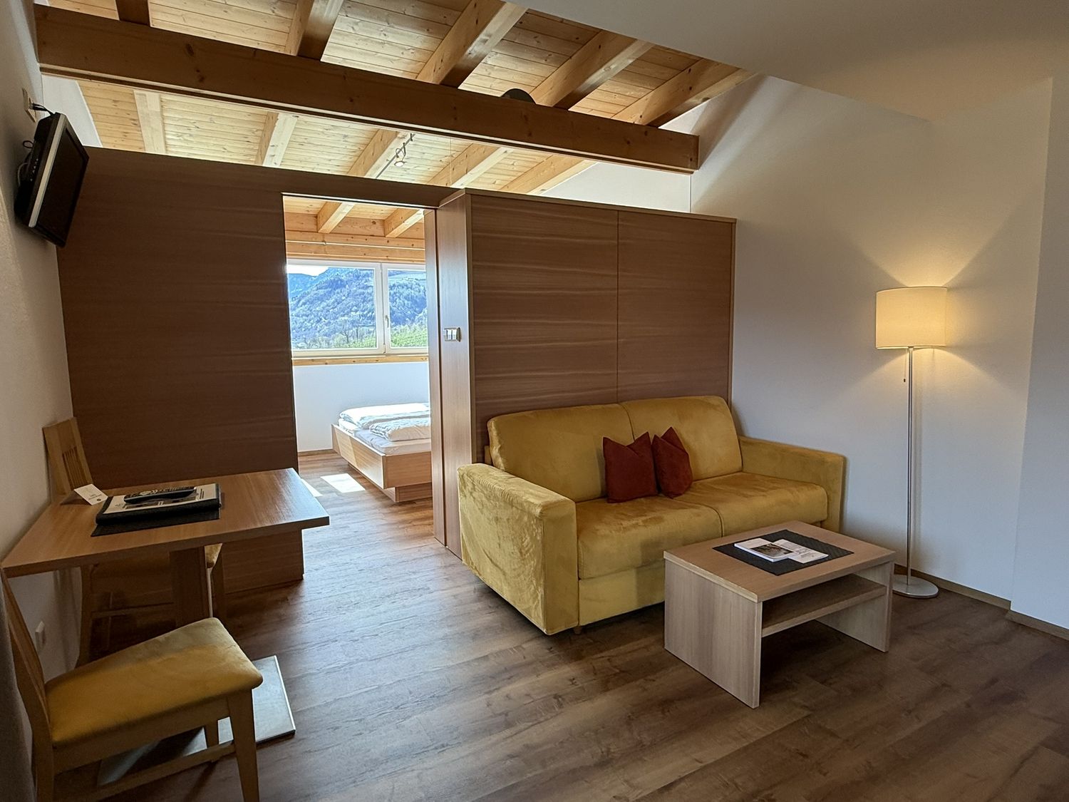 Junior-Suite im 2. Stock mit getrenntem Wohn- und Schlafbereich, großzügigem Balkon mit Blick auf die hauseigenen Obstgärten und das Vigiljoch, großes Panoramafenster mit Ausblick auf Lana und das Etschtal.